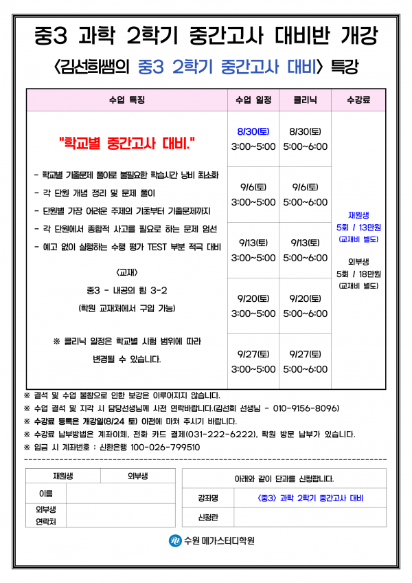 중등 과학 2학기 중간고사 대비 프로그램 개강 페이지 정보 작성자 최고관리자 작성일 25-08-07 12:06 조회 1,051회 댓글 0건 본문 중등 과학 2학기 중간고사 대비 프로그램 개강