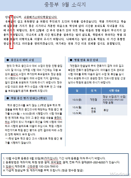 2025년 중등부 9월 소식지(가정통신문) 페이지 정보 작성자 최고관리자 작성일 25-09-19 21:17 조회 707회 댓글 0건 본문 * 10월 등록은 9월 30일(화)까지입니다.