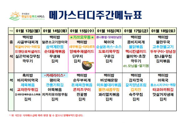 1월 2주차 식단표(1/13~1/18)