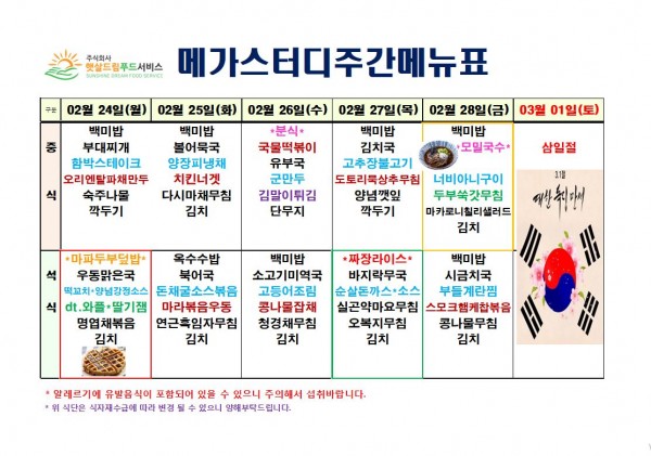 2월 4주차 식단표(2/24~2/28)