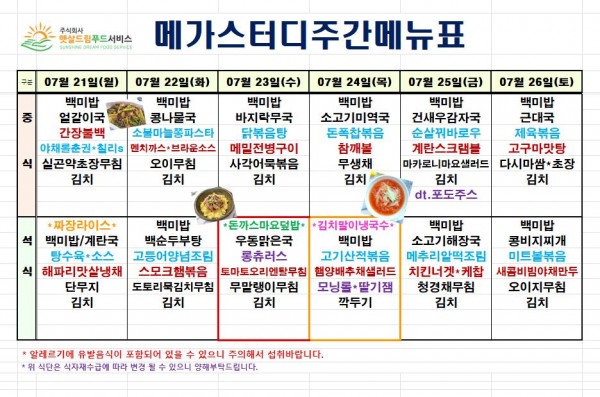 7월 4주차 식단표(7/21~7/26)