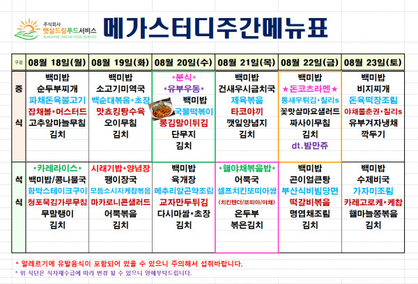 8월 3주차 식단표(8/18~8/23)